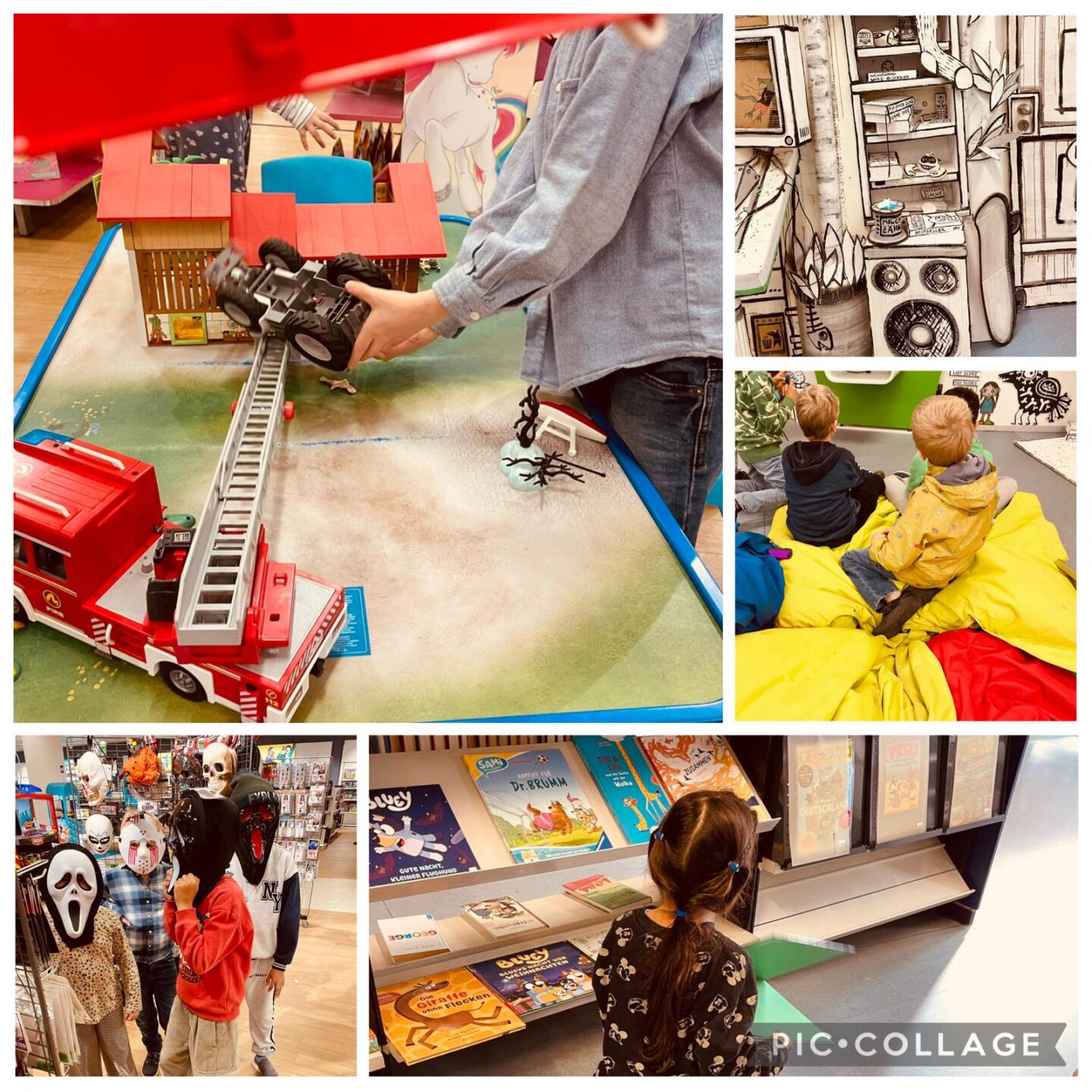 Da Regen angesagt war fuhren wir mit dem Bus zur Stadtbücherei. Nach einer Frühstückspause betrachteten wir erst die Künstlerausstellung im Erdgeschoss…da gab es wirklich sehr Interessantes und Eindrucksvolles zu sehen und zu hören 👍. Danach kam die Stadtbücherei (mit begrenzter Zeitangabe für die Computerspiele), Augenshopping in Karstadt und zuletzt ein Spiel mit den Schachsteinen.