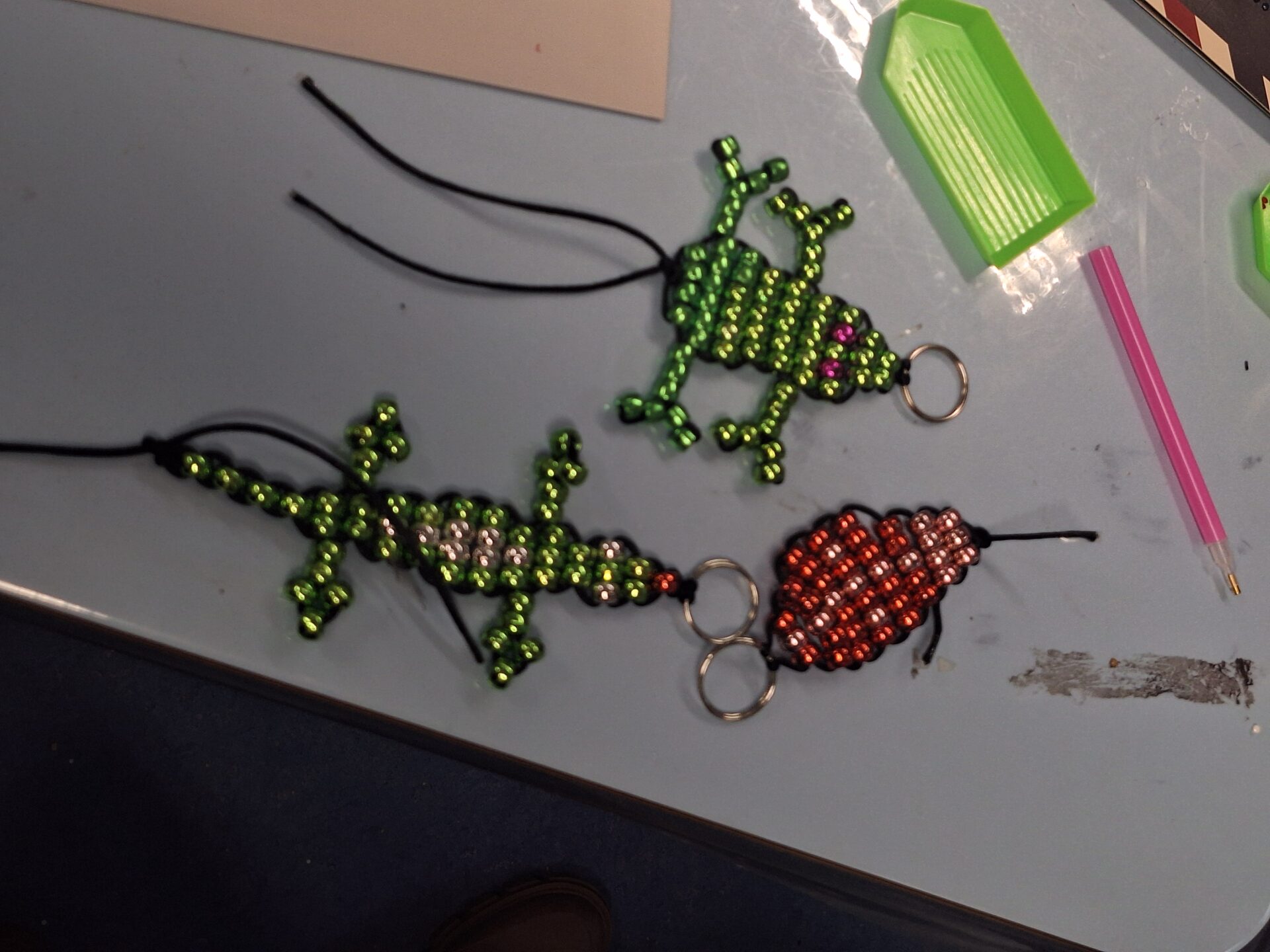 Aus Perlen haben die Kinder verschiedene Tiere(Maus,Salamander, Marienkäfer,Fisch) gefädelt 🦎🐠